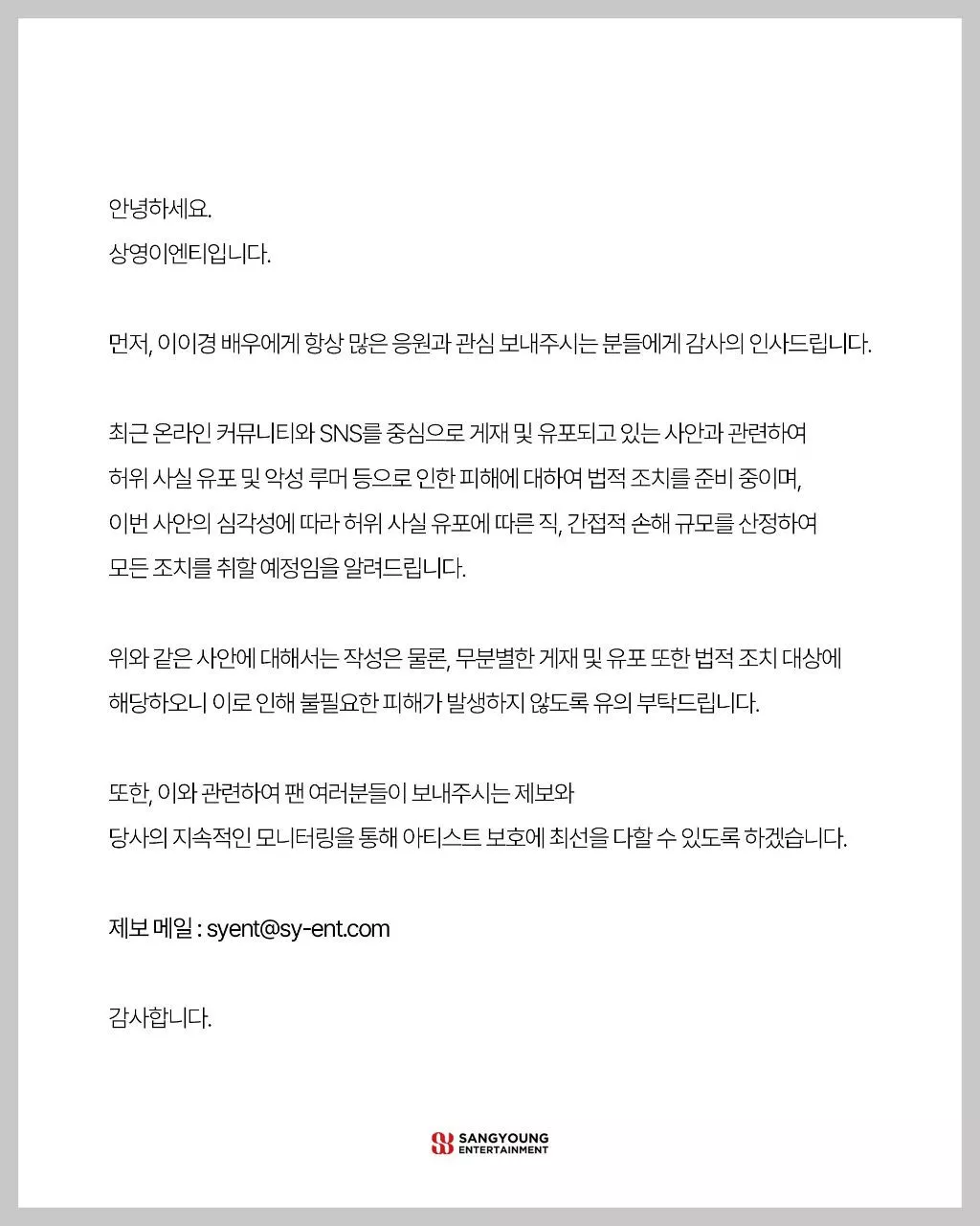 안녕하세요. 상영이엔티입니다. 먼저, 이이경 배우에게 항상 많은 응원과 관심 보내주시는 분들에게 감사의 인사드립니다. 최근 온라인 커뮤니티와 SNS를 중심으로 게재 및 유포되고 있는 사안