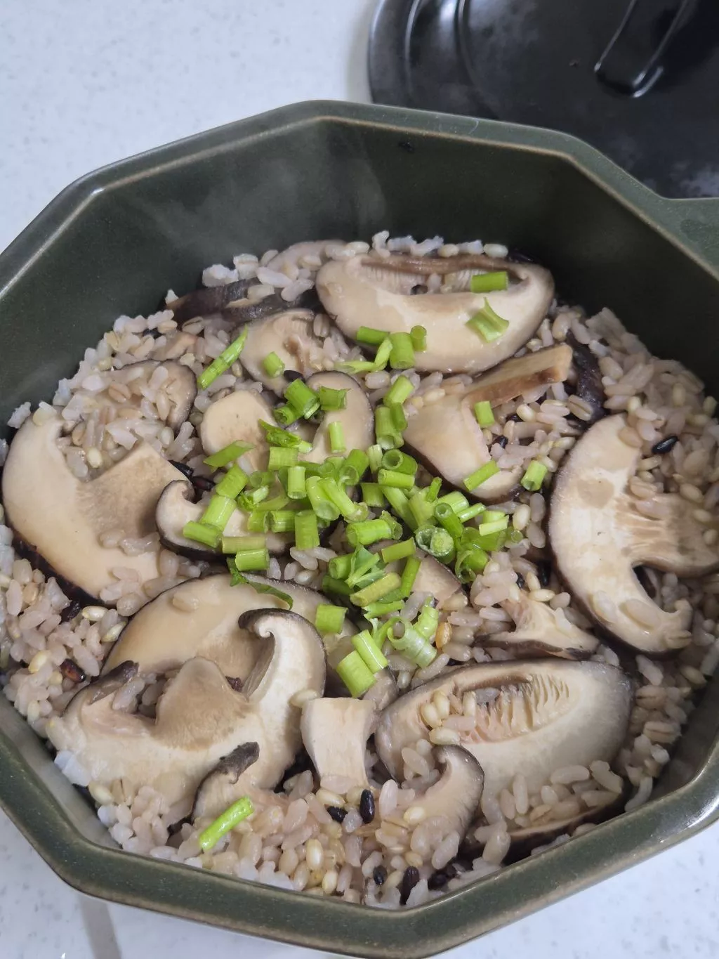 표고버섯 잔뜩 넣고 미나리 송송 썰어 얹은 버섯솥밥