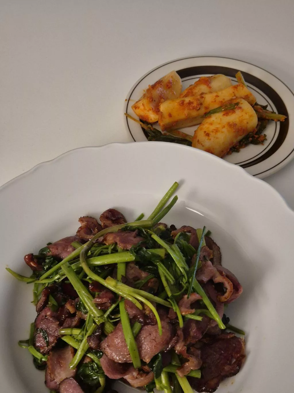 냉동실에 훈제오리 있길래 볶고 미나리 남은거랑 같이 볶아 먹음 꿀맛