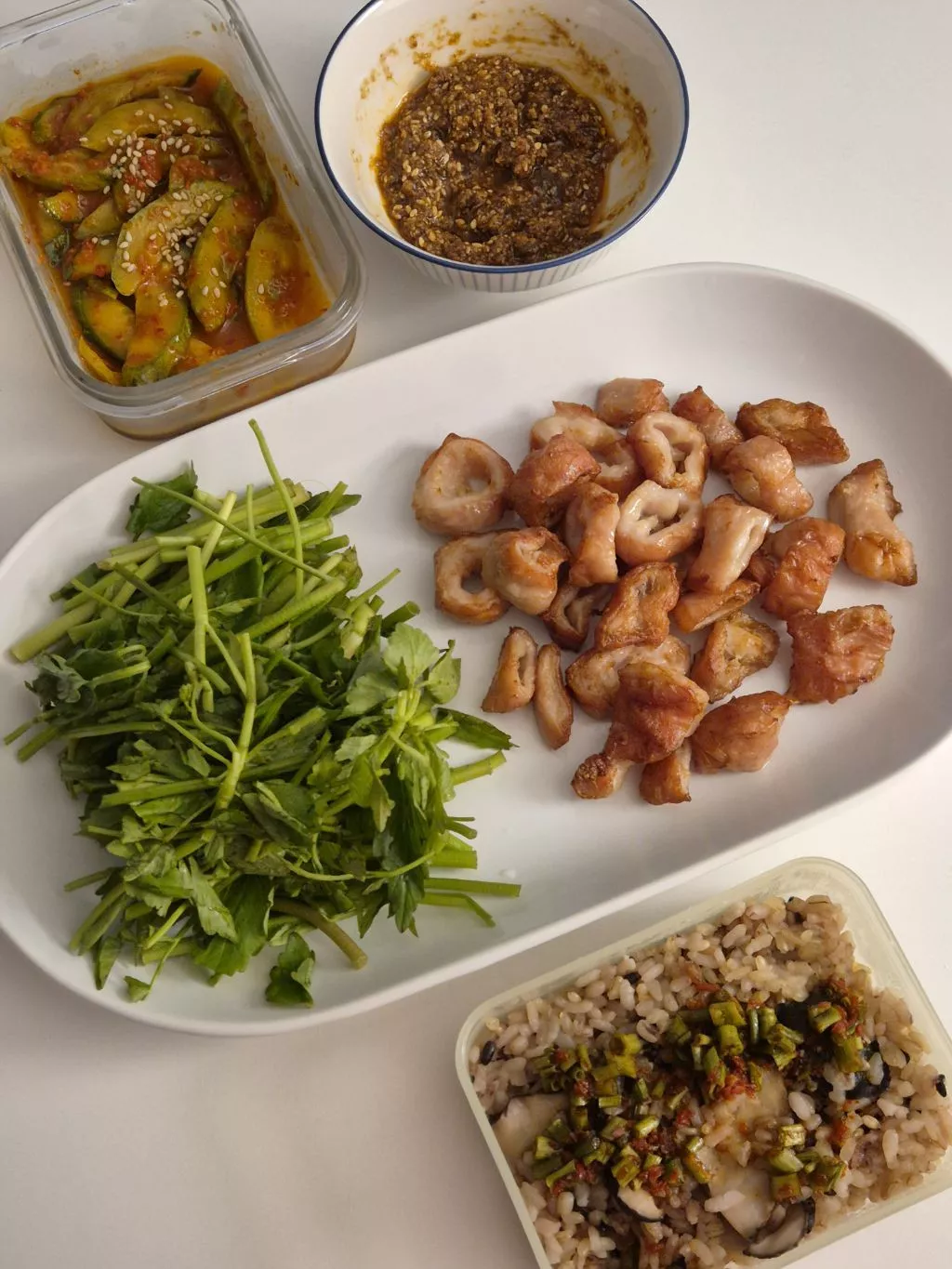 냉동해둔 버섯솥밥 데우고 돼지막창 있는거 에프돌려서 먹음 막장 만들려니 뭐가 없길래 대충