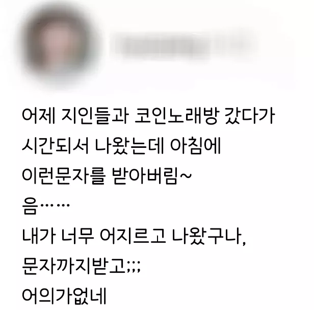 어제 지인들과 코인노래방 갔다가 아침에 이런 문자를 받아버림.