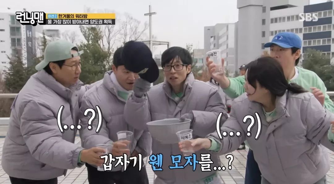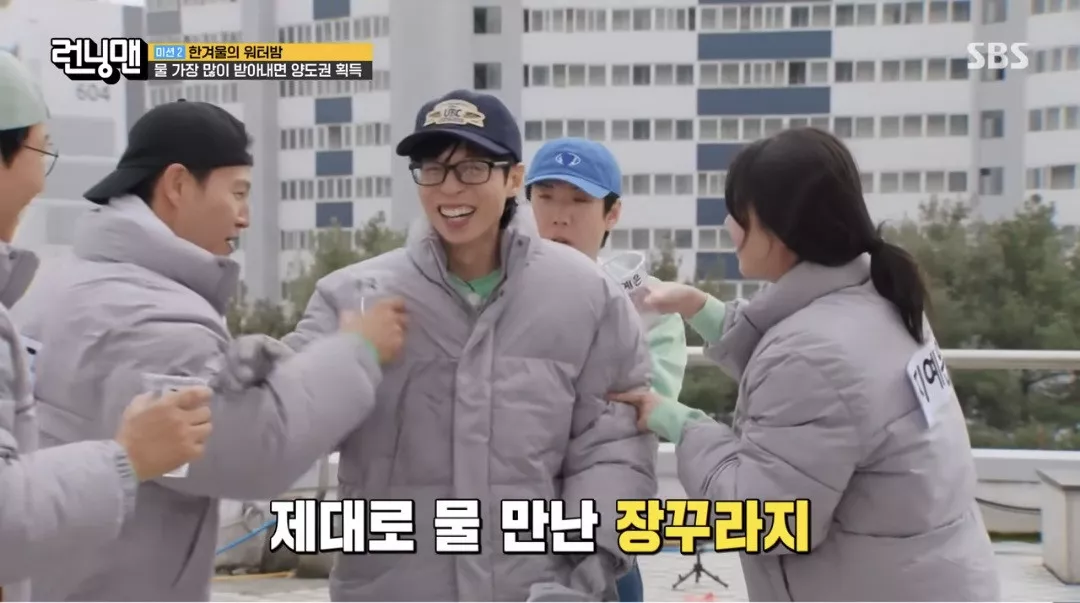이렇게 유재석이 뿌리는 물 받는 게임하는데