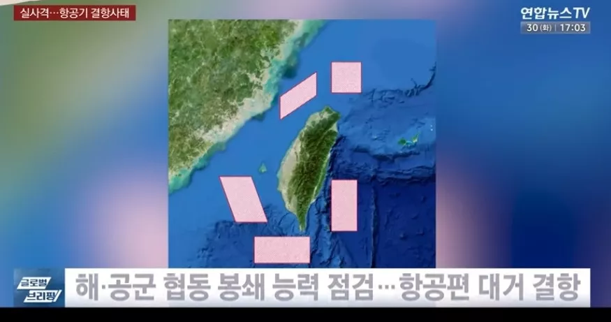 중국 인민해방군 동부전구가 공개한 함정 편대 다방향 근접전 훈련지도. 중국이 일련의 비전쟁 강압행동을 통해 전쟁을 하지 않고도 대만을 실질적으로 장악하는 시나리오를 미 연구소들이 제시했다