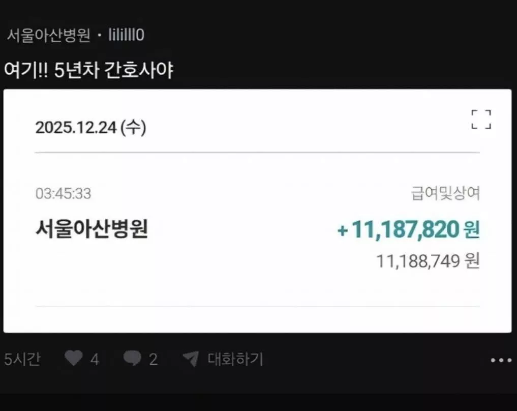 아산병원 5년차 간호사 12월 월급(상여금 포함)