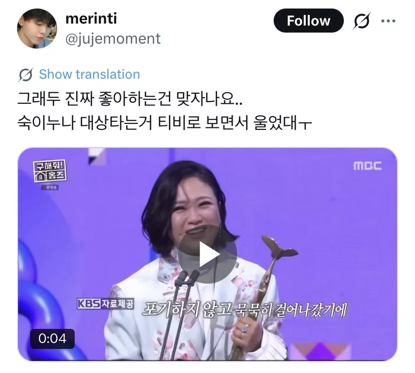 김숙 옛날에 대상 탈때 (2020년 연참 동료시절) 집에서 방송으로 보면서 울고 ㅋㅋㅋㅋ