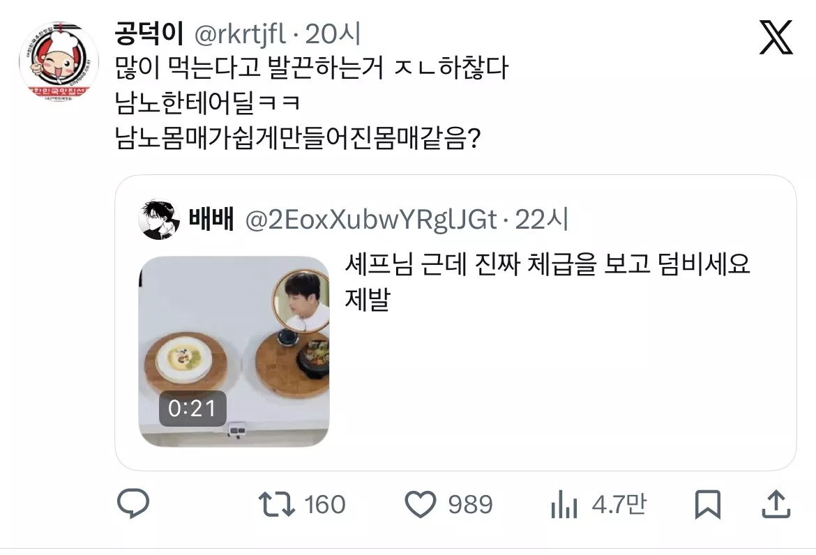 ex) 그래도 적게 먹는 손종원이 나음ㅋ