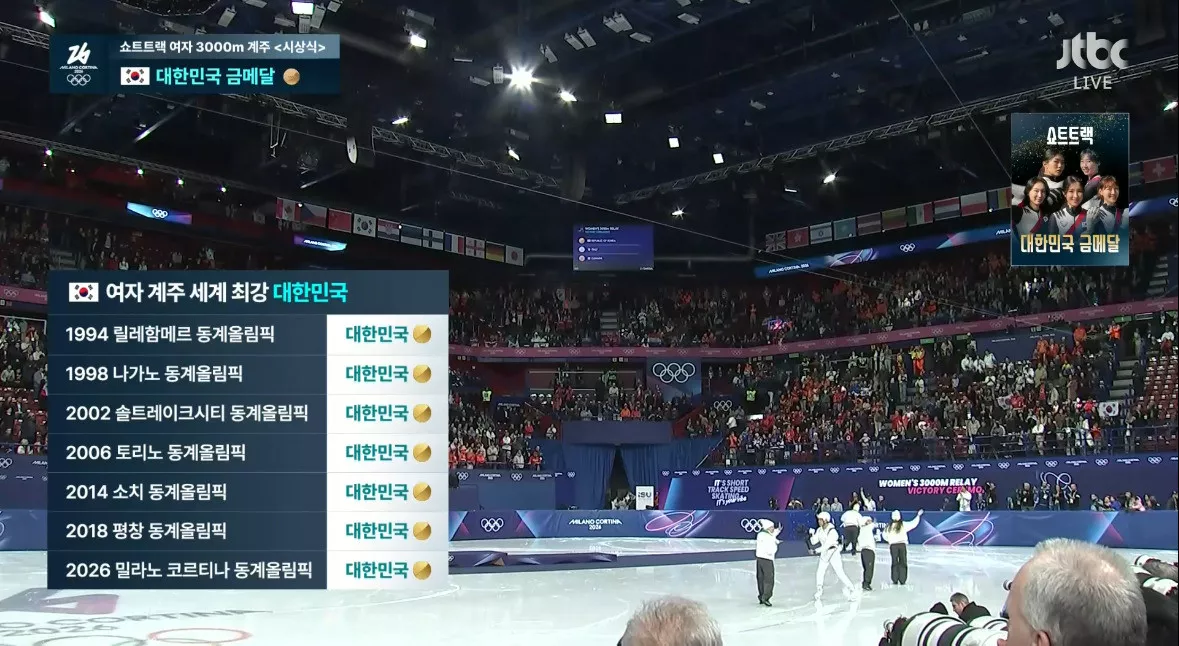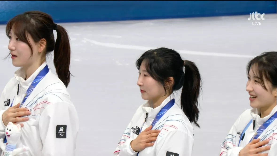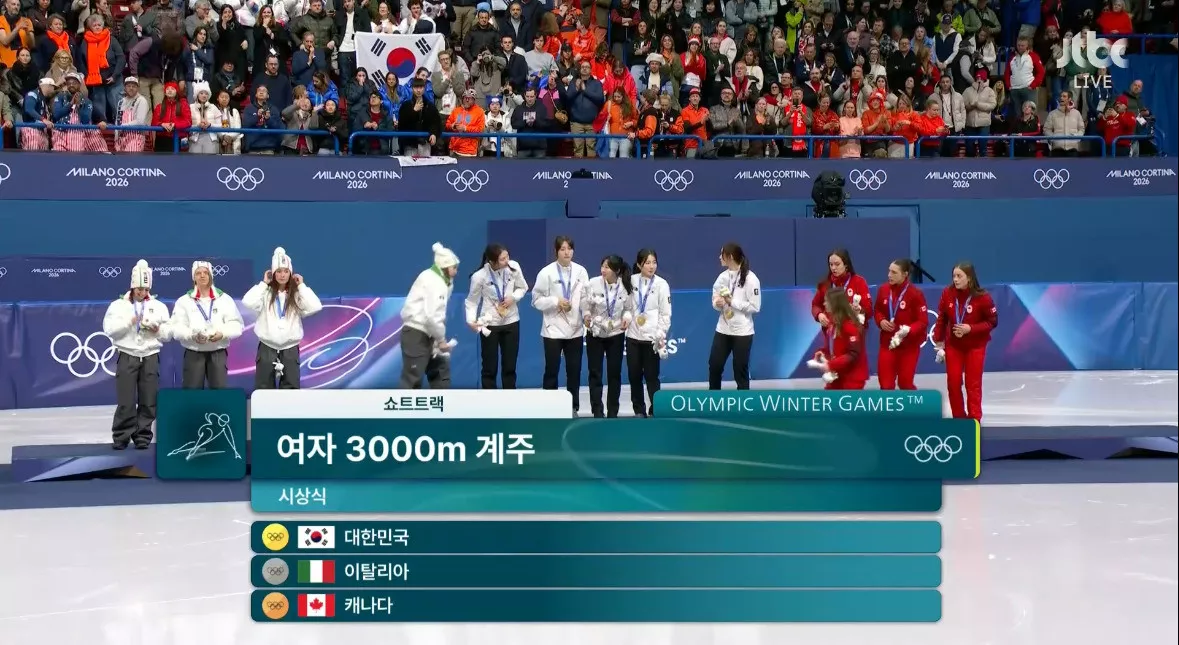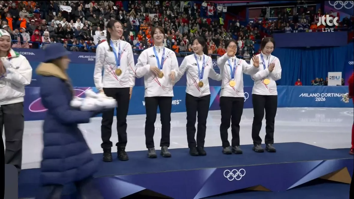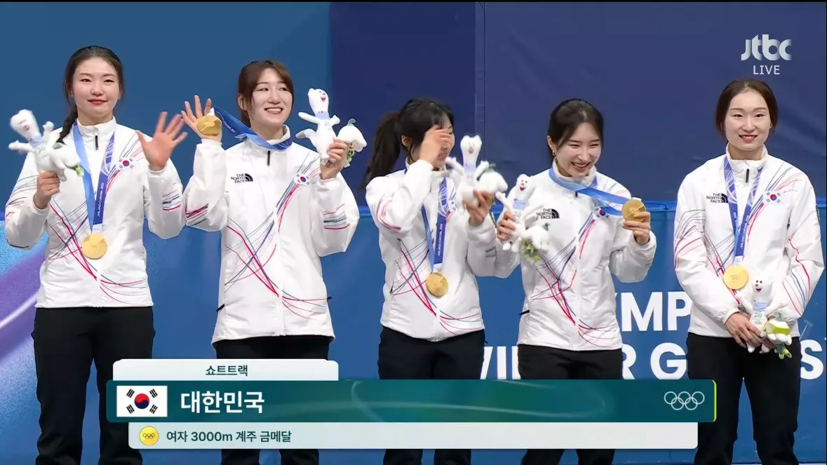 시상식 오른 쇼트트랙 여자 계주 금메달리스트 대한민국 선수들