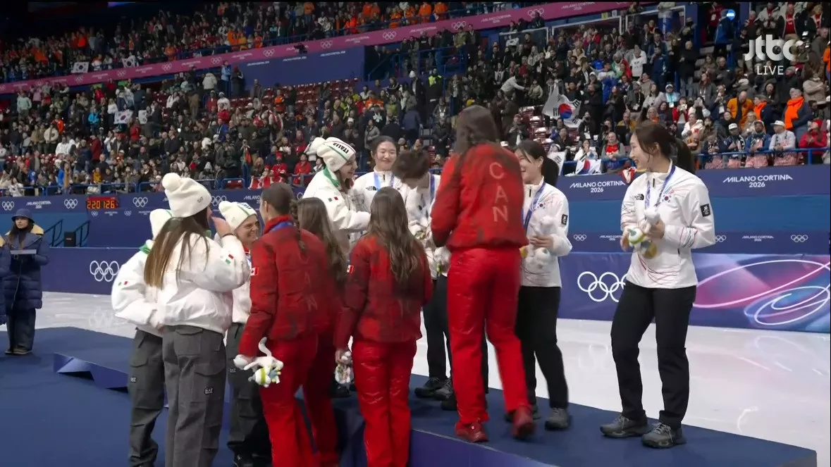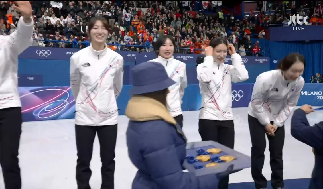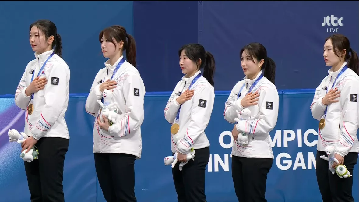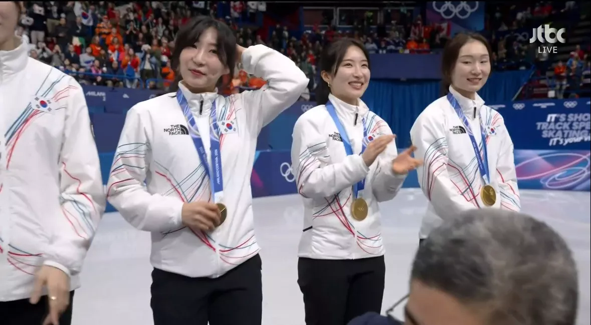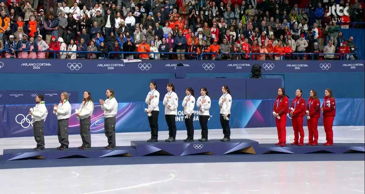 시상식 오른 쇼트트랙 여자 계주 금메달리스트 대한민국 선수들
