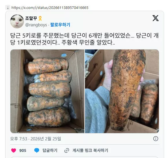 당근 5키로를 주문했는데 당근이 6개만 들어있었슨... 당근이 개당 1키로였던것이다.. 주황색 무인줄 알았다