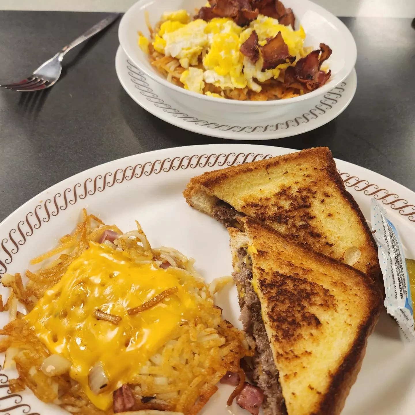 주로 와플이나 토스트, 오믈렛 같은 아침식사 메뉴가 많은데 햄버거나 스테이크도 있고 메뉴가 다양합니다.