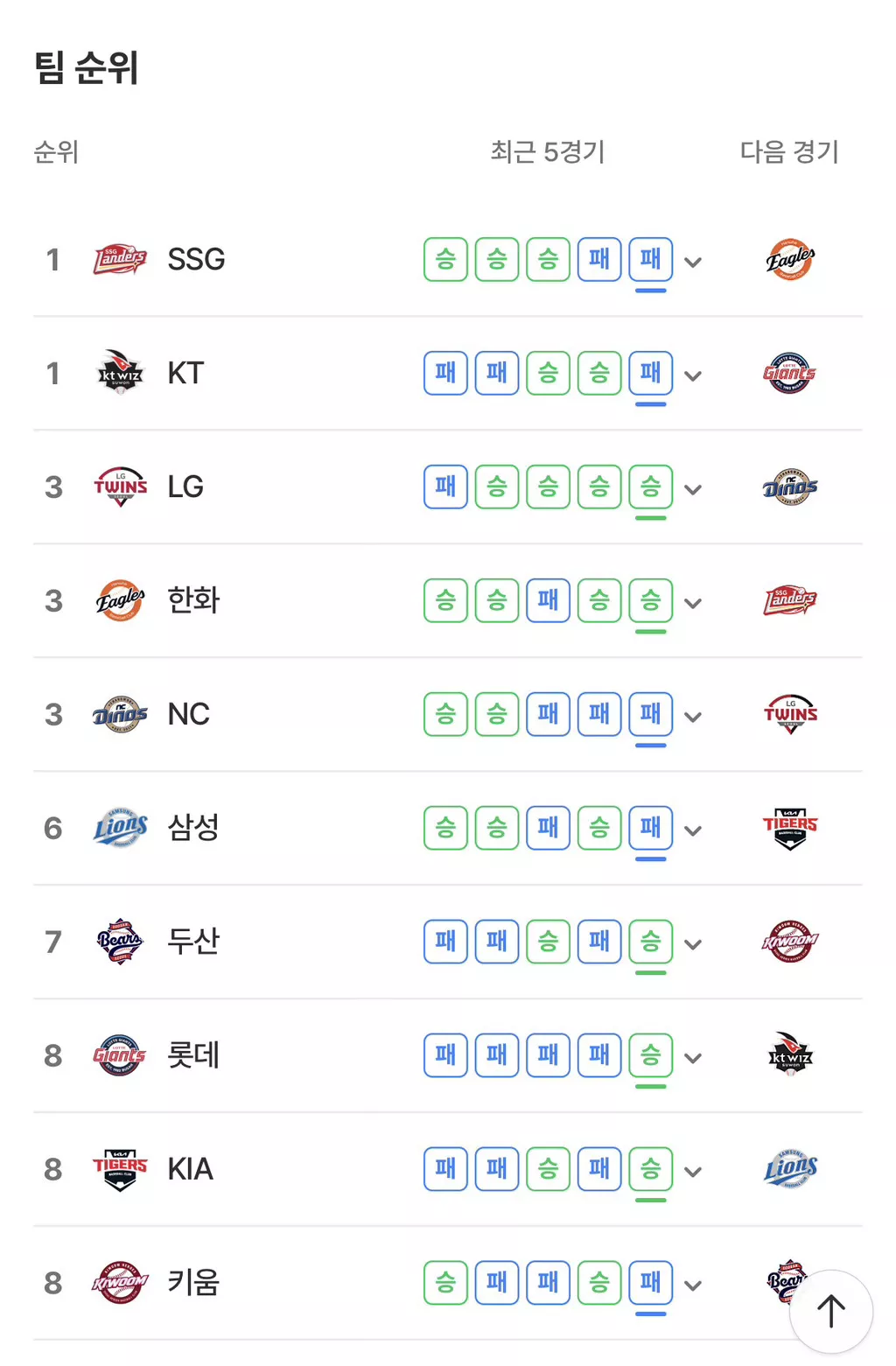 [KBO] 4월 8일 오늘자 야구 결과 및 팀순위