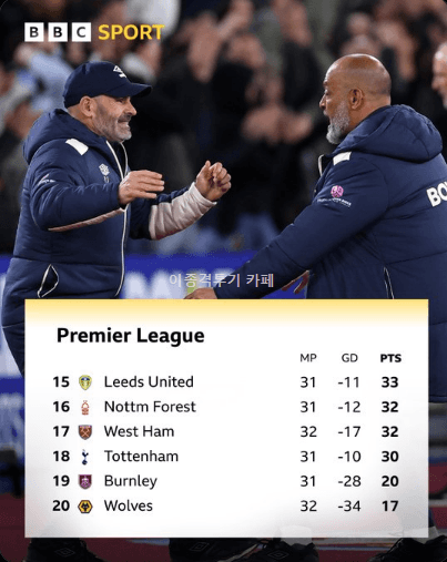 토튼햄 5월 일정이 AV(원정) - 리즈(홈) - 첼시(원정) - 에버튼(홈) 이라서 데제르비 매직 없으면 강등 확률 매우 높아짐