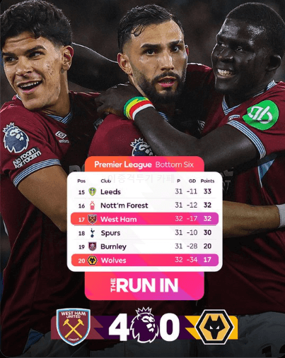 웨스트햄이 울버햄튼 잡고 17위로 순위 상승