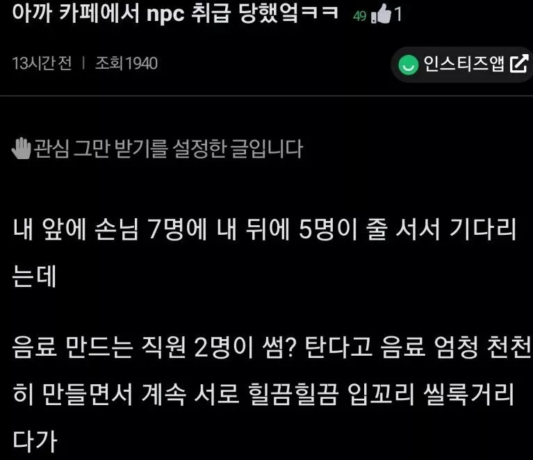 아까 카페에서 npc취급 당했엌ㅋㅋ