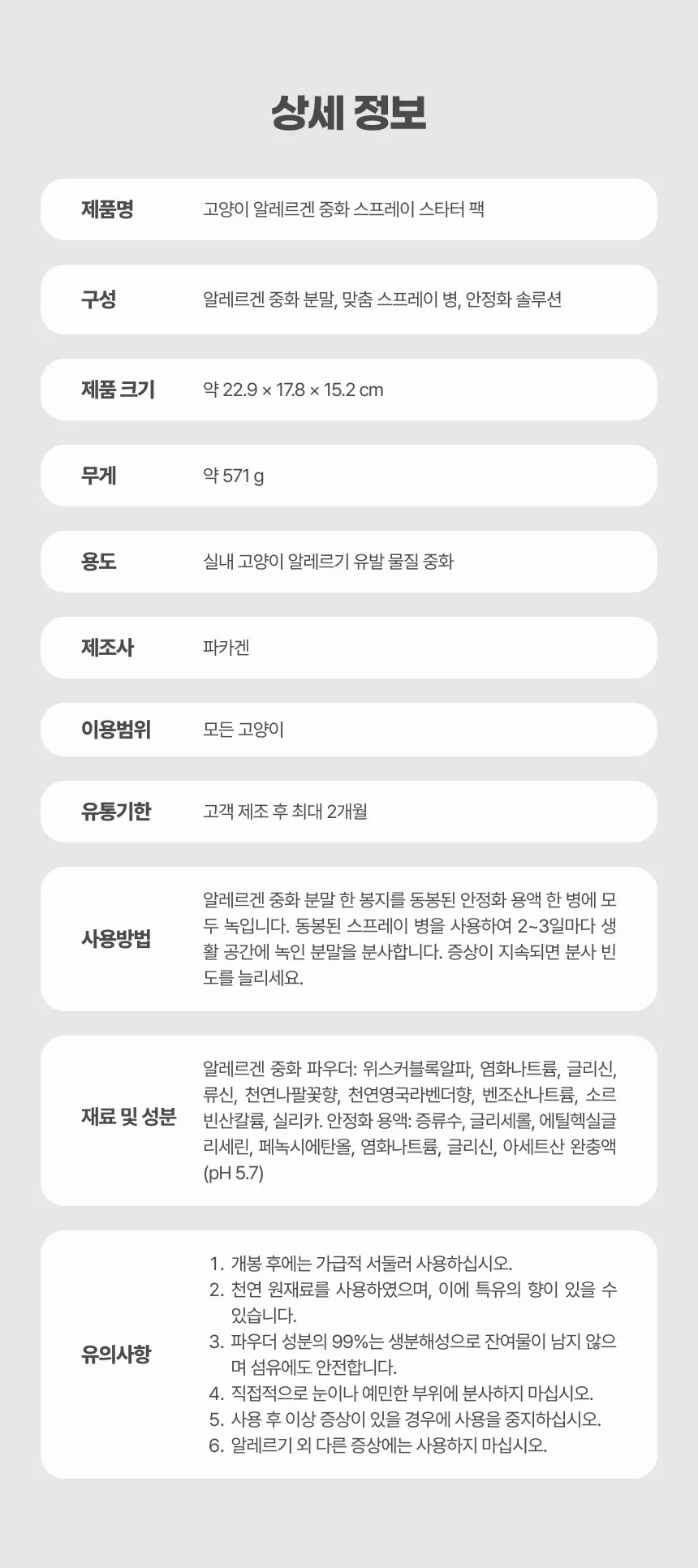 품명 및 모델명 | 파카젠 고양이 알레르겐 중화 스프레이 스타터 팩 275ml |