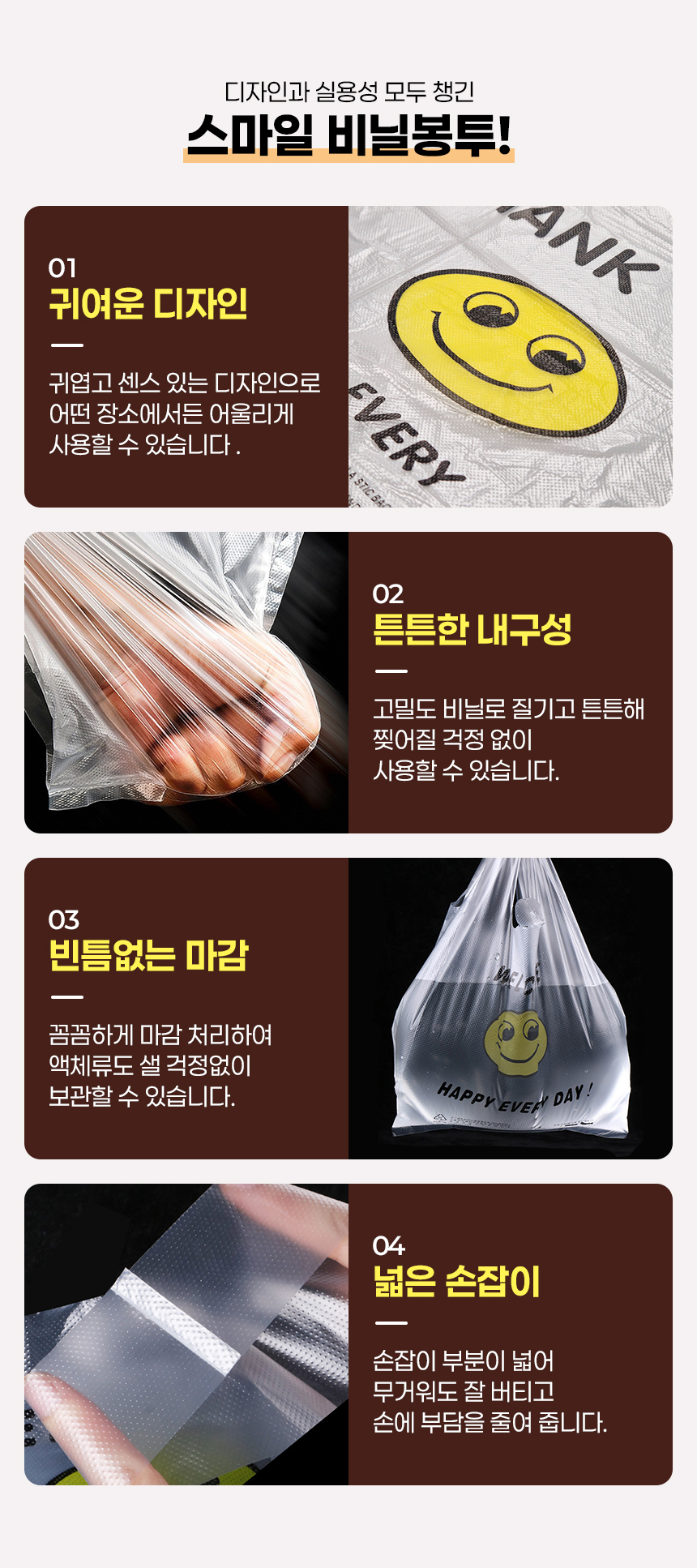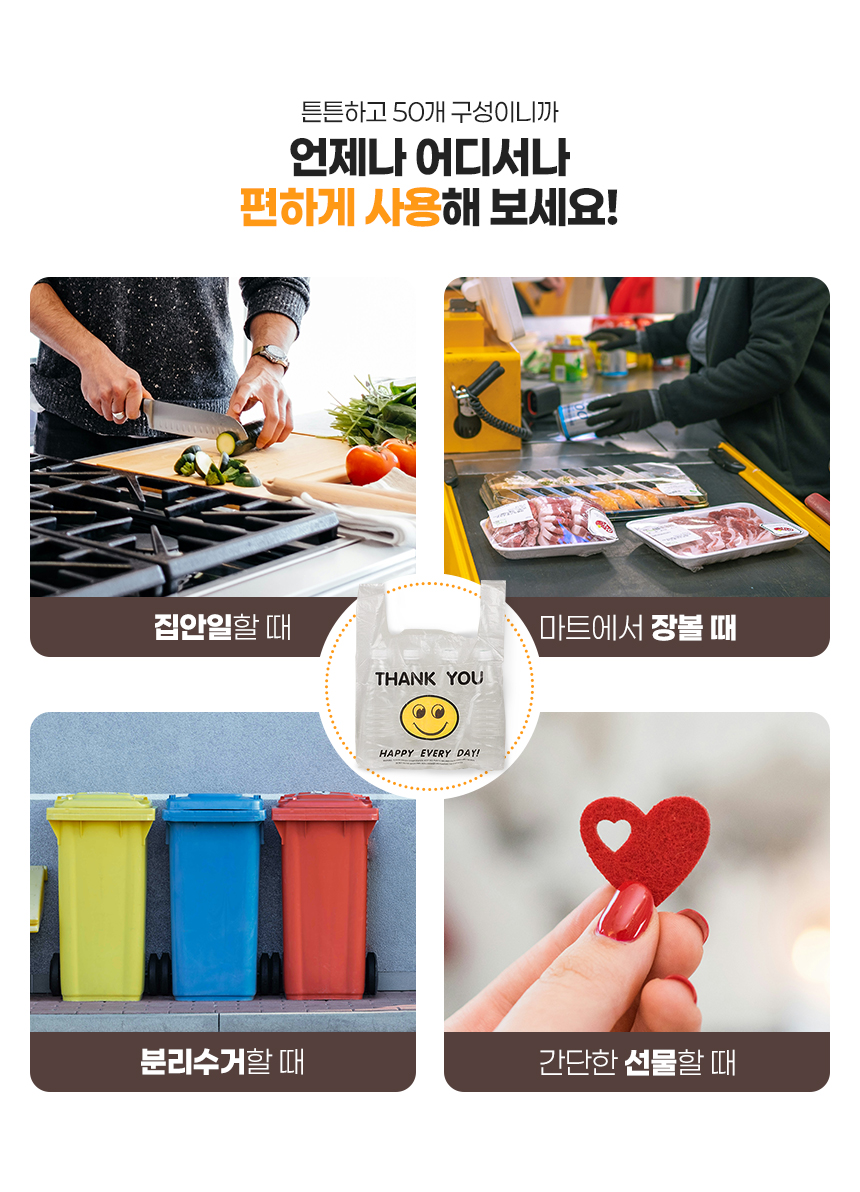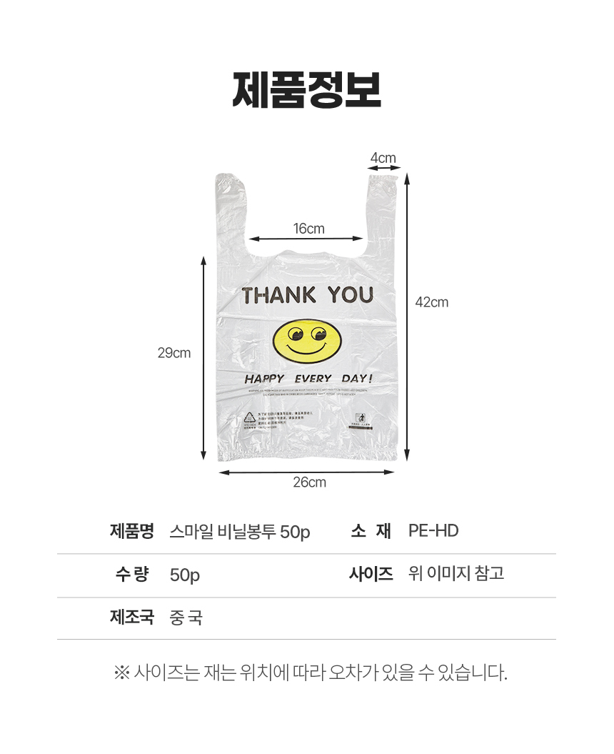 | 상품정보제공고시 | 품명: 스마일 비닐봉투 투명 쇼핑백 비닐봉지 50개입 모델명: TS14188404 제조자(수입자): 머니로드 제조국: 대한민국 A/S 책임자와 전화번호: 상세페이지 참조 |