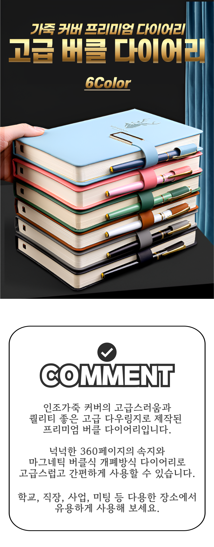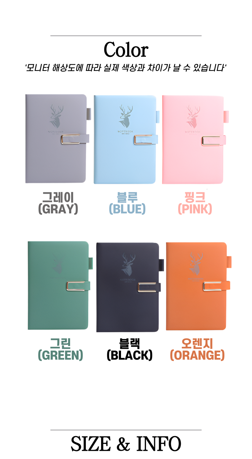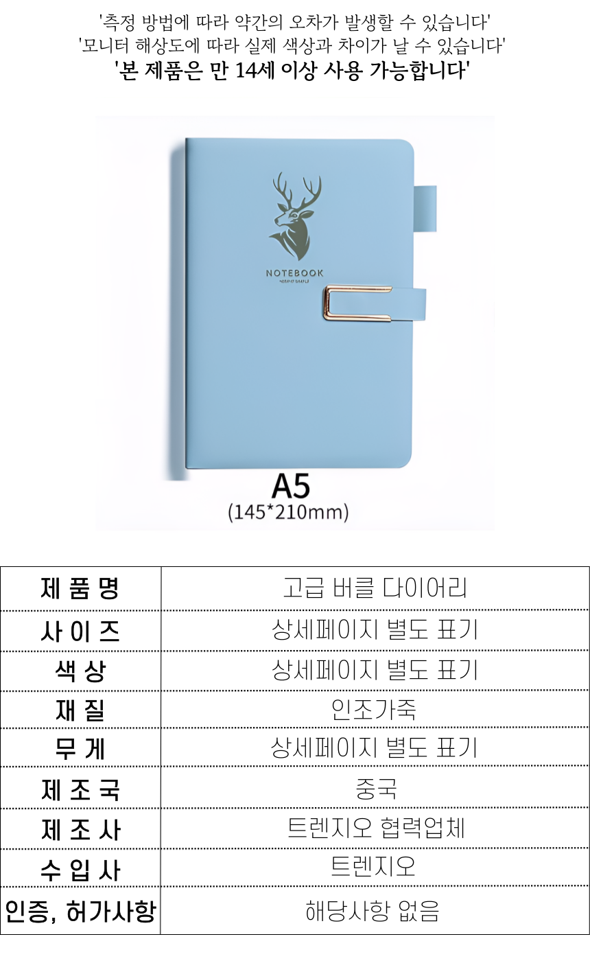 | 상품정보제공고시 | 품명: 고급 다이어리 프리미엄 노트 마그네틱 버클 메모장 공책 수첩 일기장 플래너 모델명: TS14638967 제조자(수입자): 트렌지오 협력사 제조국: 대한민국 A/S 책임자와 전화번호: 상세페이지 참조 |