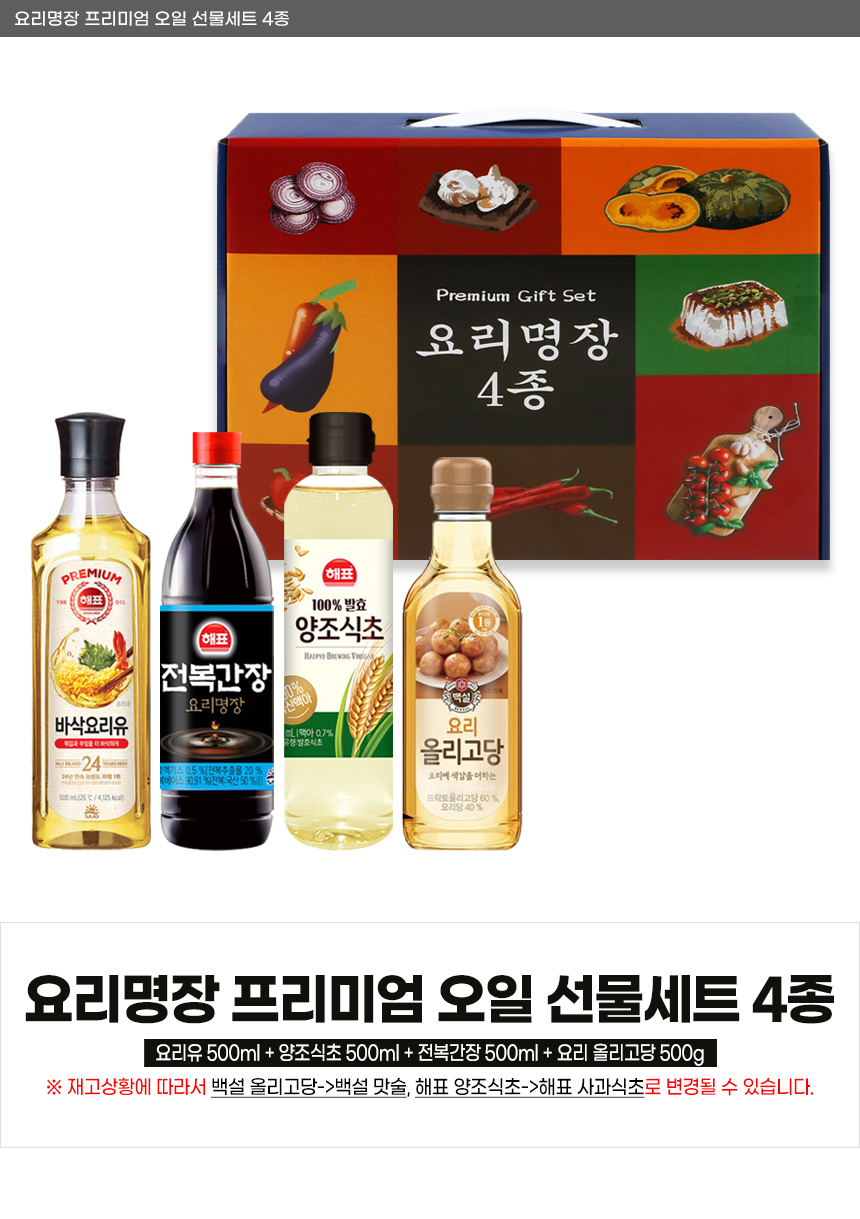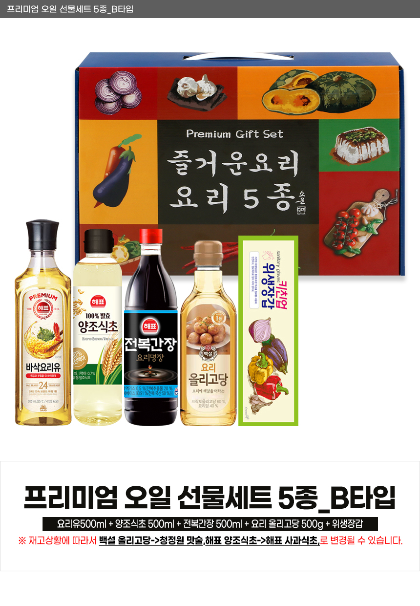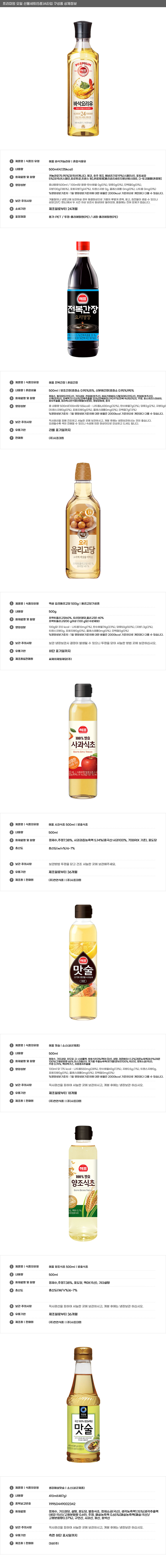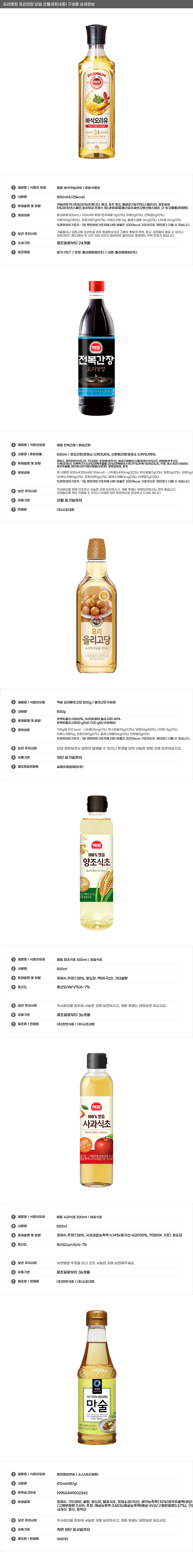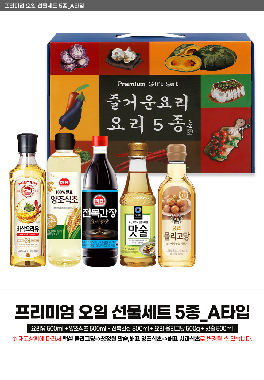 | 상품정보제공고시 | 품명: 스폐셜 오일 선물세트 건강 식용유 식초 간장 올리고당 모음 명절선물 모델명: TS14537419 제조자(수입자): 베르플레이스 제조국: 대한민국 A/S 책임자와 전화번호: 상세페이지 참조 |