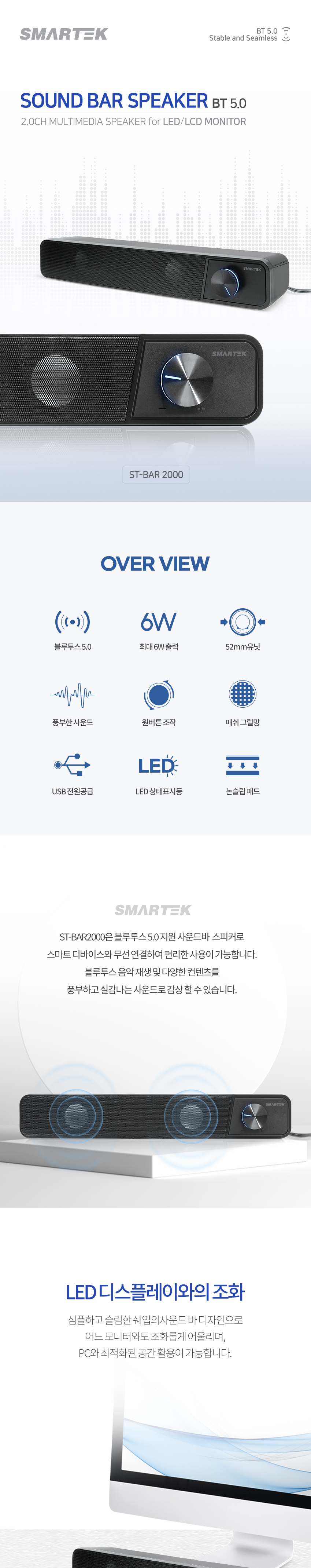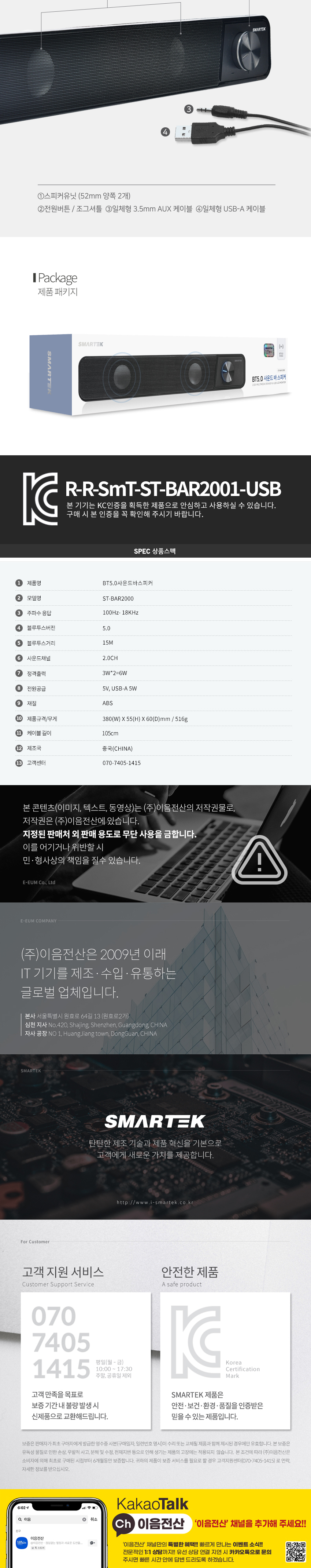 | 상품정보제공고시 | 품명: 유선스피커 바형 스마텍 PC용 고음질 데스크스피커 가정용 기업용 모델명: TS14578396 제조자(수입자): 베르플레이스 제조국: 대한민국 A/S 책임자와 전화번호: 상세페이지 참조 |