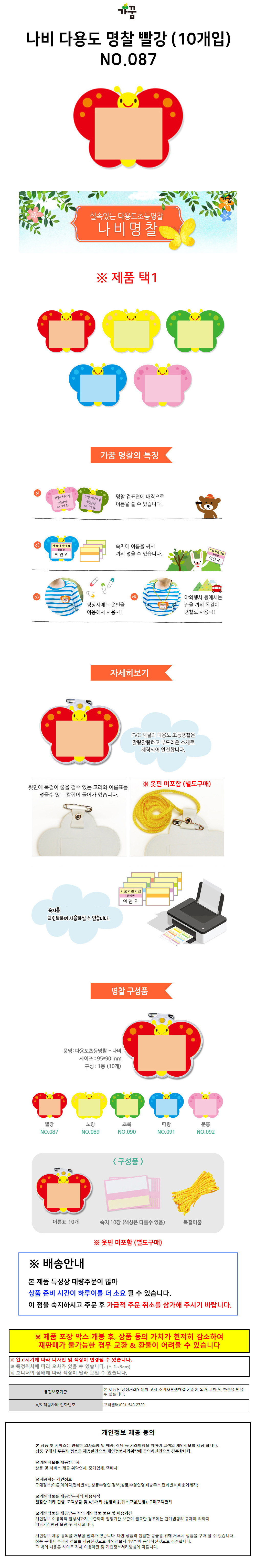| 상품정보제공고시 | 품명: 가꿈 명찰 나비 (빨강) (10개입) (NO.087) 초등학교 유치원 어린이집 입학 이름표 모델명: TS14613039 제조자(수입자): 가꿈 제조국: 대한민국 A/S 책임자와 전화번호: 상세페이지 참조 |