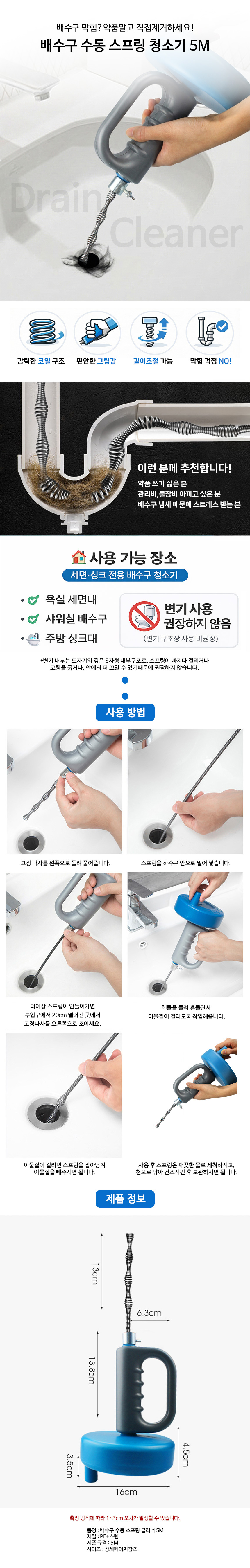 | 상품정보제공고시 | 품명: 배수구 하수구 막힌배관 뚫기 스프링 청소기 모델명: TS14619560 제조자(수입자): 케이엠트레이드 제조국: 대한민국 A/S 책임자와 전화번호: 상세페이지 참조 |