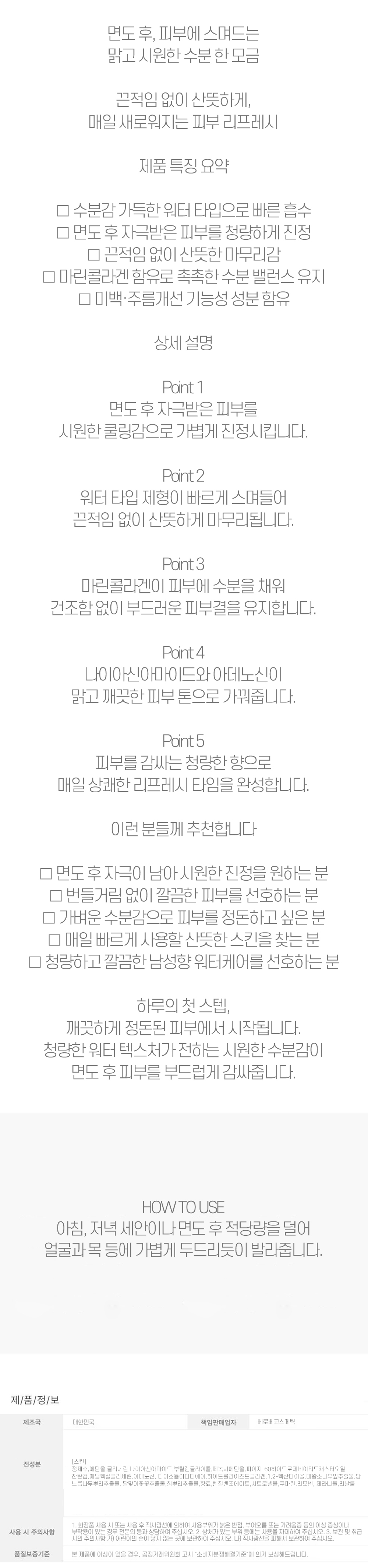 | 상품정보제공고시 | 품명: 끈적임없이 수분 가득한 산뜻한 타입 남성 스킨 300ml 모델명: TS14597895 제조자(수입자): 아마레파리 제조국: 대한민국 A/S 책임자와 전화번호: 상세페이지 참조 |
