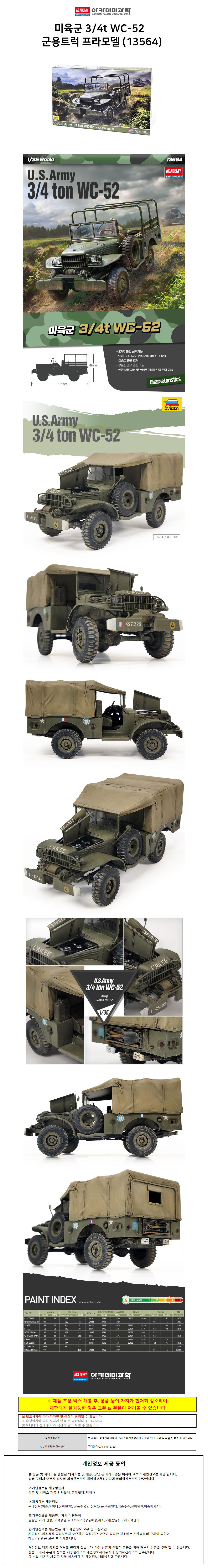 | 상품정보제공고시 | 품명: 아카데미과학 프라모델 미육군 4분의 3 ton WC-52 군용트럭 (13564) 모델명: TS14600474 제조자(수입자): 아카데미과학 제조국: 대한민국 A/S 책임자와 전화번호: 상세페이지 참조 |