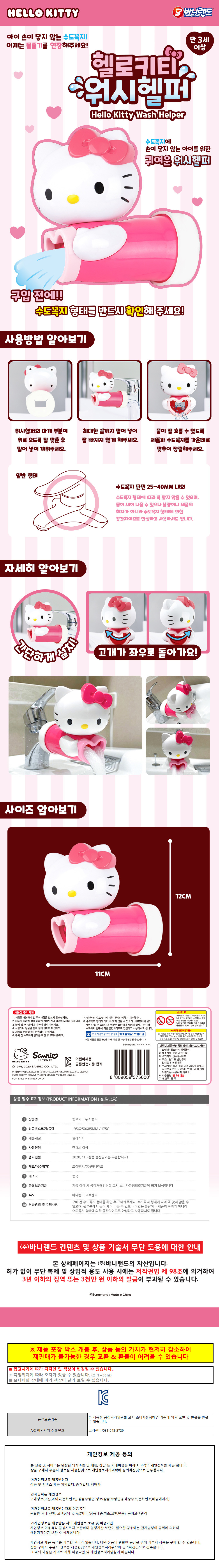 | 상품정보제공고시 | 품명: 바니랜드 수도꼭지 세면대 워시헬퍼 (헬로키티) 유아 아동 세면용품 모델명: TS14591055 제조자(수입자): 바니랜드 제조국: 대한민국 A/S 책임자와 전화번호: 상세페이지 참조 |