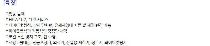 | HPW103-220V | 220V | 3/8 | 물, 공기, 기름, 불황성가스 | 황동몸체 | 1EA | |