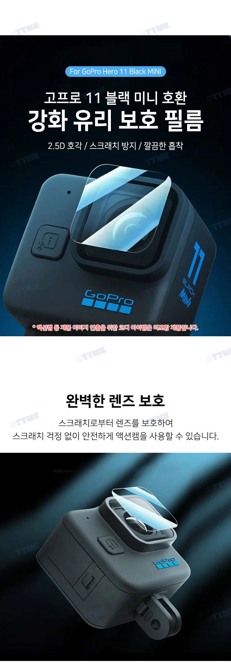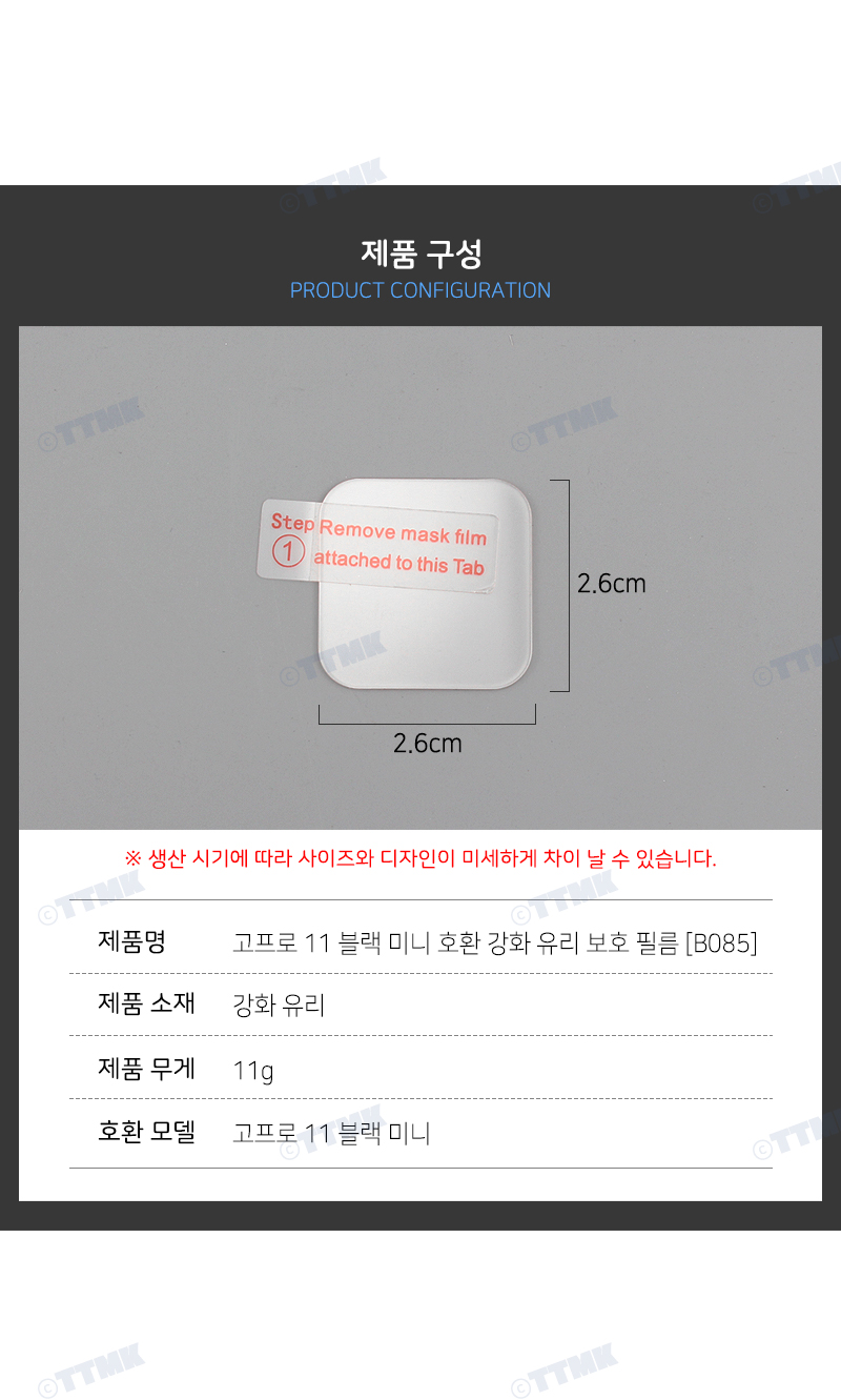 | 상품정보제공고시 | 품명: 렌즈 액정 보호 유리 필름 커버 고프로 11 미니 호환 모델명: TS14586135 제조자(수입자): TTMK 제조국: 대한민국 A/S 책임자와 전화번호: 상세페이지 참조 |