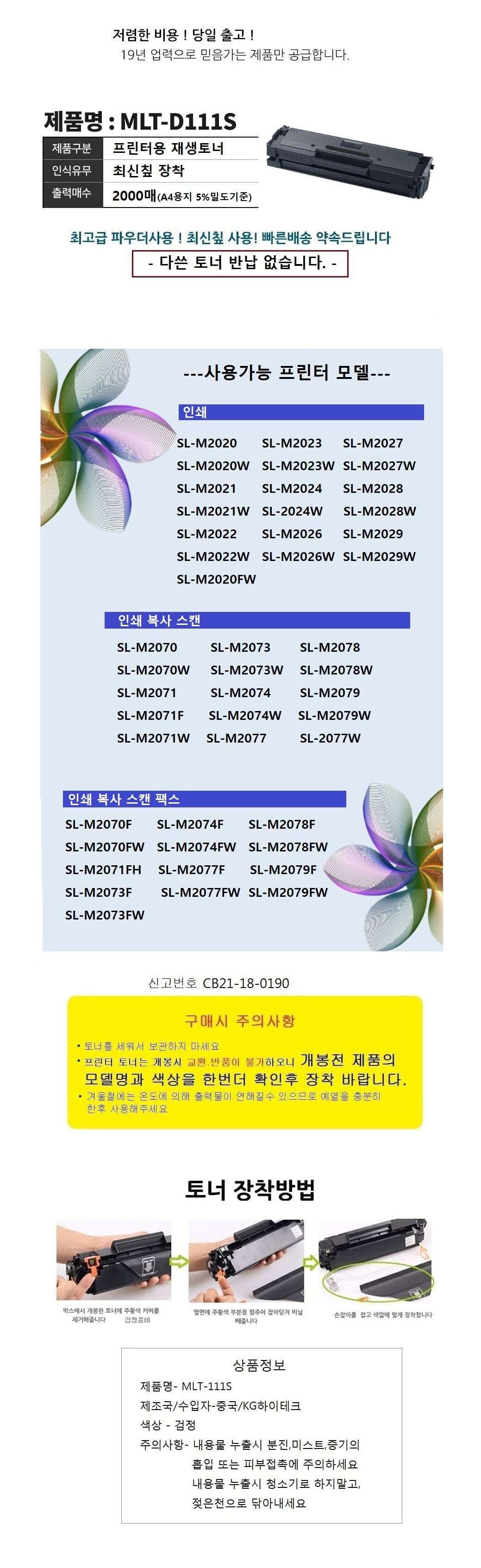 | 상품정보제공고시 | 품명: MLT-D111S 신형 SL-M2073W 재생토너 고급 대용량2000매 모델명: TS14509723 제조자(수입자): INK119 제조국: 대한민국 A/S 책임자와 전화번호: 상세페이지 참조 |