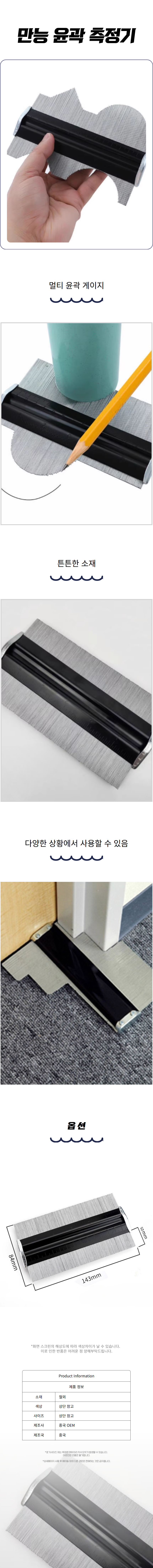 | 상품정보제공고시 | 품명: 형상 복사 산업용 만능자 형틀 모양따기 윤곽 게이지 모델명: TS14523382 제조자(수입자): 중국 OEM 제조국: 대한민국 A/S 책임자와 전화번호: 상세페이지 참조 |