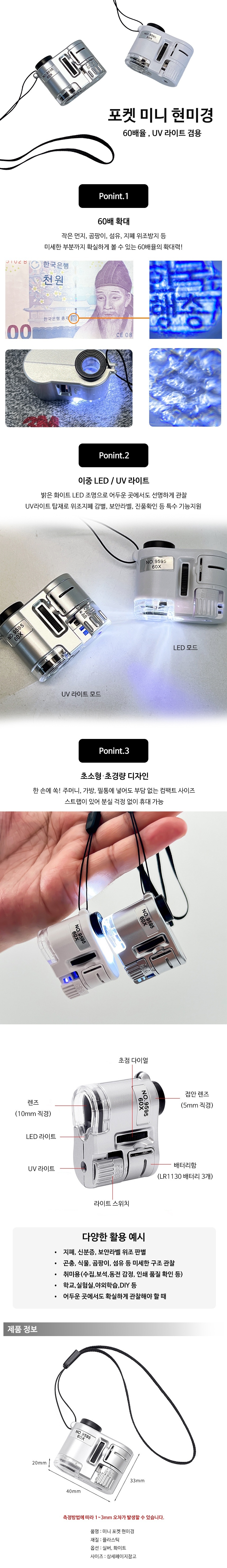 | 상품정보제공고시 | 품명: 미니 포켓 현미경 곤충관찰 휴대용 60배율 확대경 루페 모델명: TS14501571 제조자(수입자): 케이엠트레이드 제조국: 대한민국 A/S 책임자와 전화번호: 상세페이지 참조 |