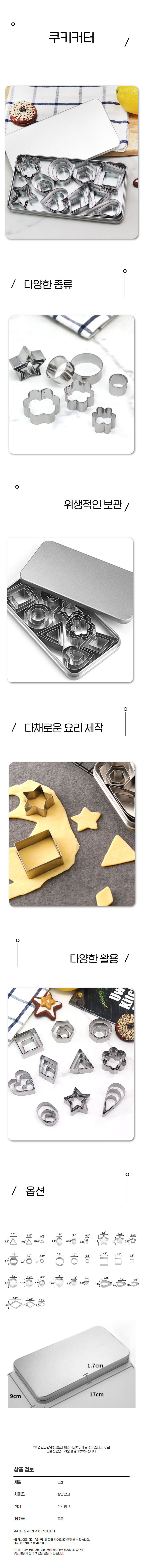 | 상품정보제공고시 | 품명: 쿠키커터 세트 홈베이킹 모양틀 스텐 초콜릿 쿠키 틀 모델명: TS14507154 제조자(수입자): 중국 OEM 제조국: 대한민국 A/S 책임자와 전화번호: 상세페이지 참조 |