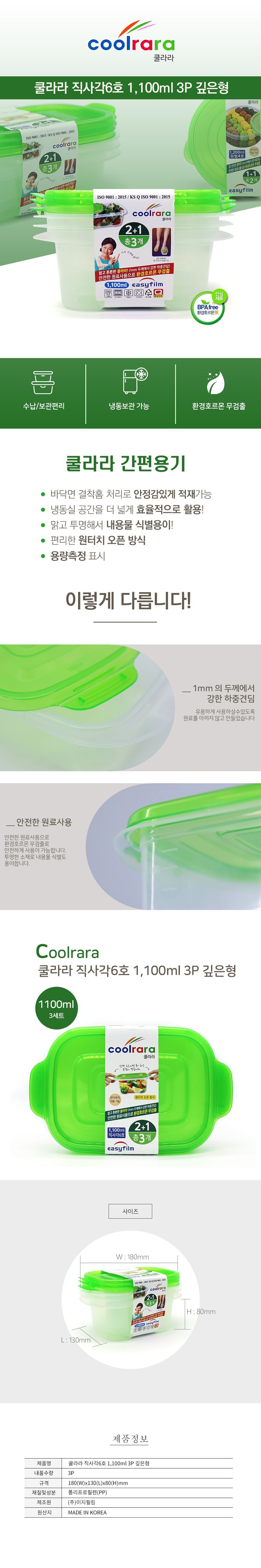 | 상품정보제공고시 | 품명: 쿨라라 밀폐용기 6호(1100ml)3P 모델명: TS14405652 제조자(수입자): YH유통(협력업체) 제조국: 대한민국 A/S 책임자와 전화번호: 상세페이지 참조 |