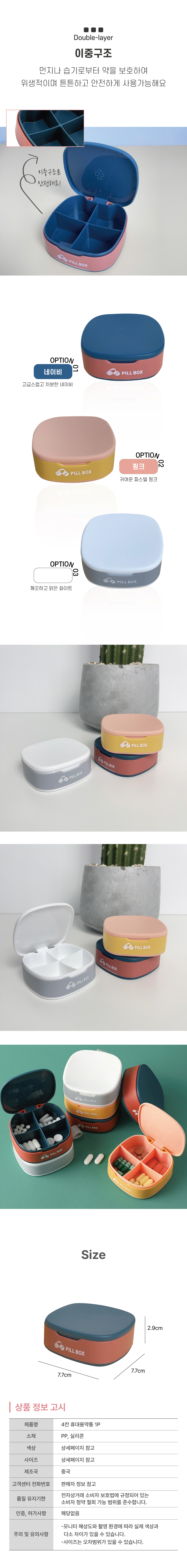| 상품정보제공고시 | 품명: 4구 휴대용약통 영양제 분리 보관 소분 여행약통 모델명: TS14292213 제조자(수입자): 아진트레이드협력사 제조국: 대한민국 A/S 책임자와 전화번호: 상세페이지 참조 |