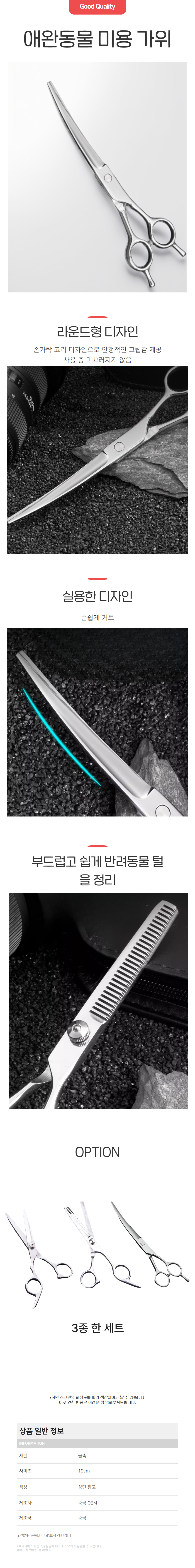 | 상품정보제공고시 | 품명: 강아지 미용가위 애완동물 셀프미용 안전커팅 3종세트 모델명: TS14535589 제조자(수입자): 중국 OEM 제조국: 대한민국 A/S 책임자와 전화번호: 상세페이지 참조 |