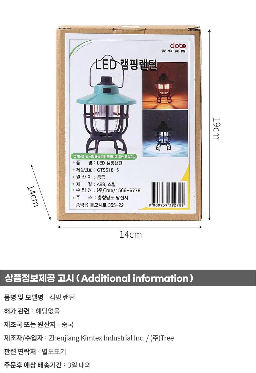 | 상품정보제공고시 | 품명: LED 원버튼 그린 캠핑랜턴 L2-건전지타입 후레쉬 등산 모델명: TS13888318 제조자(수입자): TREE 제조국: 대한민국 A/S 책임자와 전화번호: 상세페이지 참조 |