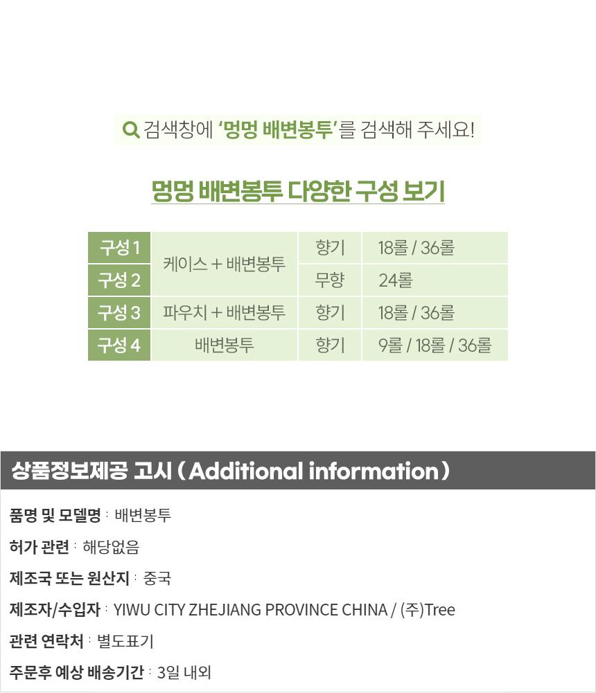 | 상품정보제공고시 | 품명: 반려동물 향기 배변봉투36롤 그린 캡슐케이스 세트 모델명: TS13892991 제조자(수입자): TREE 제조국: 대한민국 A/S 책임자와 전화번호: 상세페이지 참조 |