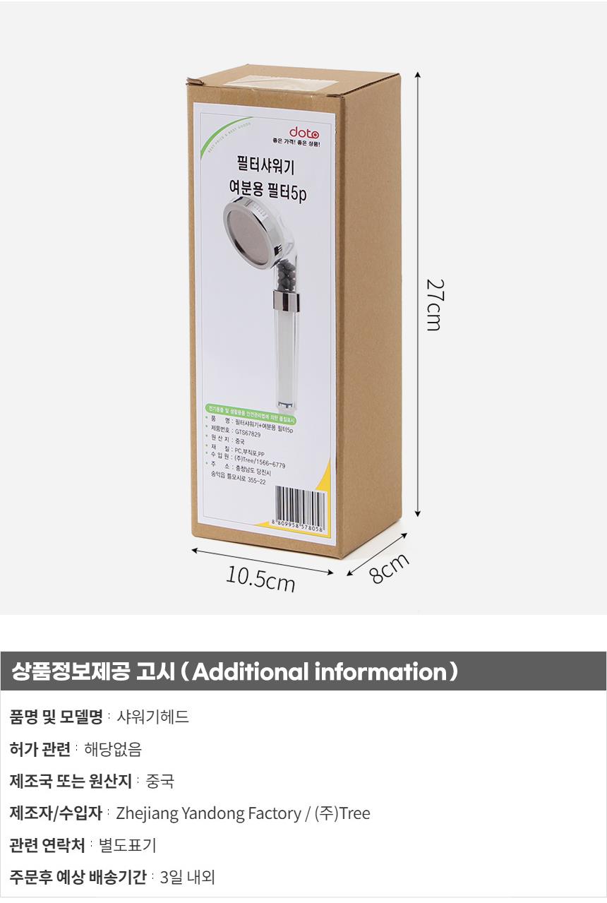 | 상품정보제공고시 | 품명: L타입 3중여과필터 샤워기헤드 교체필터 5p세트 모델명: TS13893460 제조자(수입자): TREE 제조국: 대한민국 A/S 책임자와 전화번호: 상세페이지 참조 |