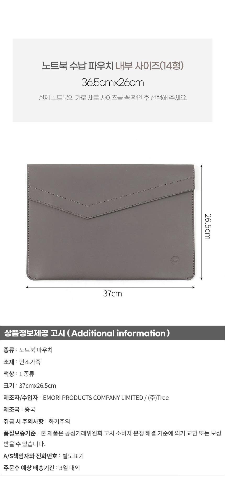 | 상품정보제공고시 | 품명: 코코아 가죽 슬리브 노트북 파우치 14형 노트북운반 모델명: TS13894441 제조자(수입자): TREE 제조국: 대한민국 A/S 책임자와 전화번호: 상세페이지 참조 |
