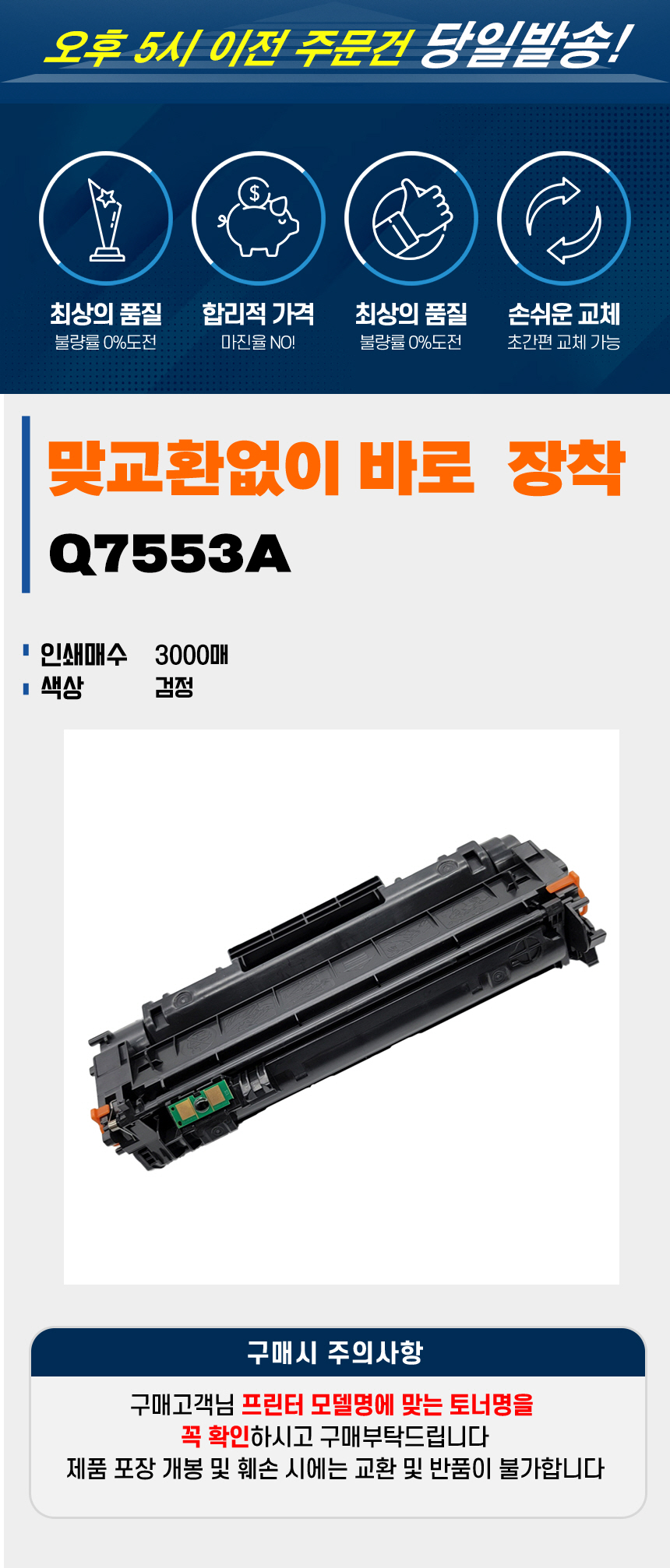 | 상품정보제공고시 | 품명: TTSM사 HP Laserjet P2014n 재생토너 표준용량 검정 Q7553A 모델명: TS13413043 제조자(수입자): 잉리트 제조국: 대한민국 A/S 책임자와 전화번호: 상세페이지 참조 |