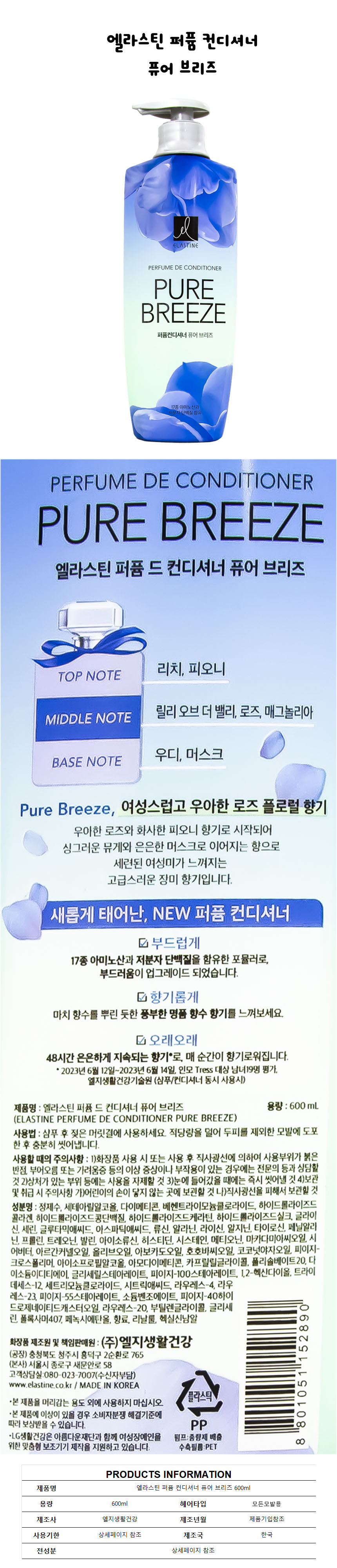 | 상품정보제공고시 | 품명: 엘라스틴 퍼퓸 컨디셔너 퓨어 브리즈 600ml 모델명: TS14371825 제조자(수입자): 엘지생활건강 제조국: 대한민국 A/S 책임자와 전화번호: 상세페이지 참조 |