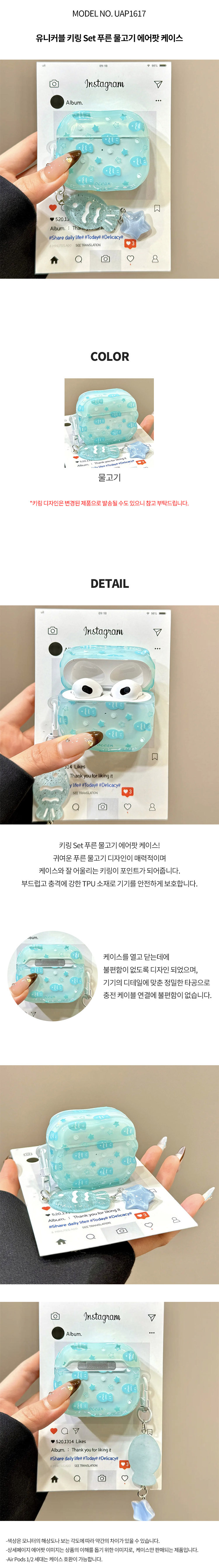 | 상품정보제공고시 | 품명: 에어팟 케이스 투명 푸른 물고기 캐릭터 귀여운 키링 세트 무선 이어폰 tpu 실리콘 파우치 4 3 2 1 프로 모델명: TS14443343 제조자(수입자): 유니버스(univers) 제조국: 대한민국 A/S 책임자와 전화번호: 상세페이지 참조 |