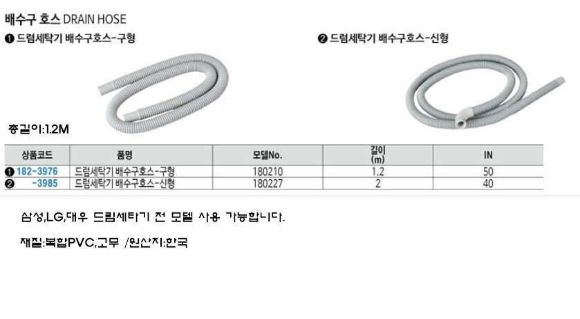 | 상품정보제공고시 | 품명: 신형 드럼세탁기 배수구 호스 모델명: TS13748025 제조자(수입자): YH유통(협력업체) 제조국: 대한민국 A/S 책임자와 전화번호: 상세페이지 참조 |