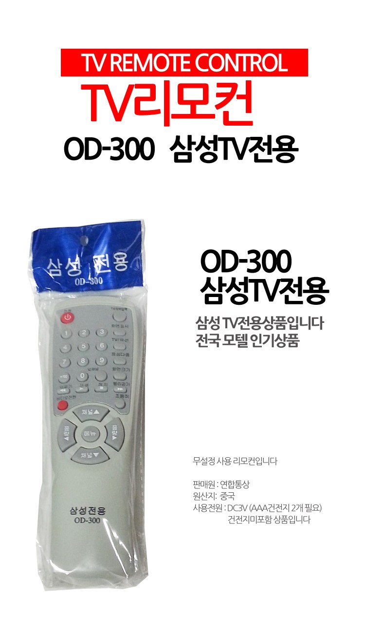 | 상품정보제공고시 | 품명: 삼성 TV 티비전용 무설정 업소용 만능 리모컨 리모콘 모델명: TS13540056 제조자(수입자): 연합통상 제조국: 대한민국 A/S 책임자와 전화번호: 상세페이지 참조 |
