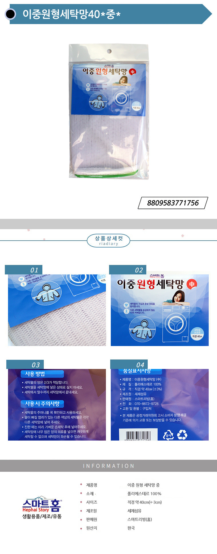 | 상품정보제공고시 | 품명: 슈마켓 이중 원형 세탁망 중 지름 40cm 편리한 세탁건조 모델명: TS14486250 제조자(수입자): 스마트홈 제조국: 대한민국 A/S 책임자와 전화번호: 상세페이지 참조 |