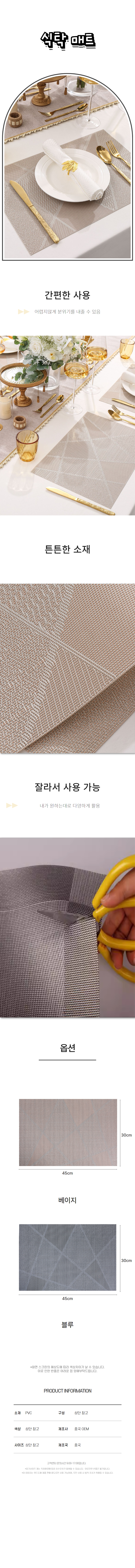 | 상품정보제공고시 | 품명: 실용적인 PVC 식탁 매트 가정용 방수 테이블보 깔개 모델명: TS14492787 제조자(수입자): 중국oem 제조국: 대한민국 A/S 책임자와 전화번호: 상세페이지 참조 |