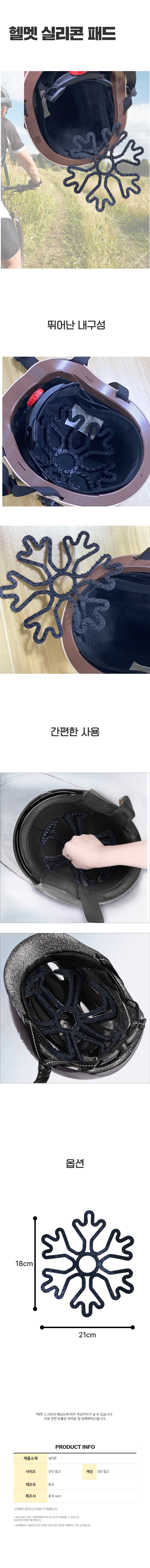 | 상품정보제공고시 | 품명: 실리콘 재질 헬멧 이너패드 자전거 머리눌림방지 패드 모델명: TS14497451 제조자(수입자): 중국 OEM 제조국: 대한민국 A/S 책임자와 전화번호: 상세페이지 참조 |