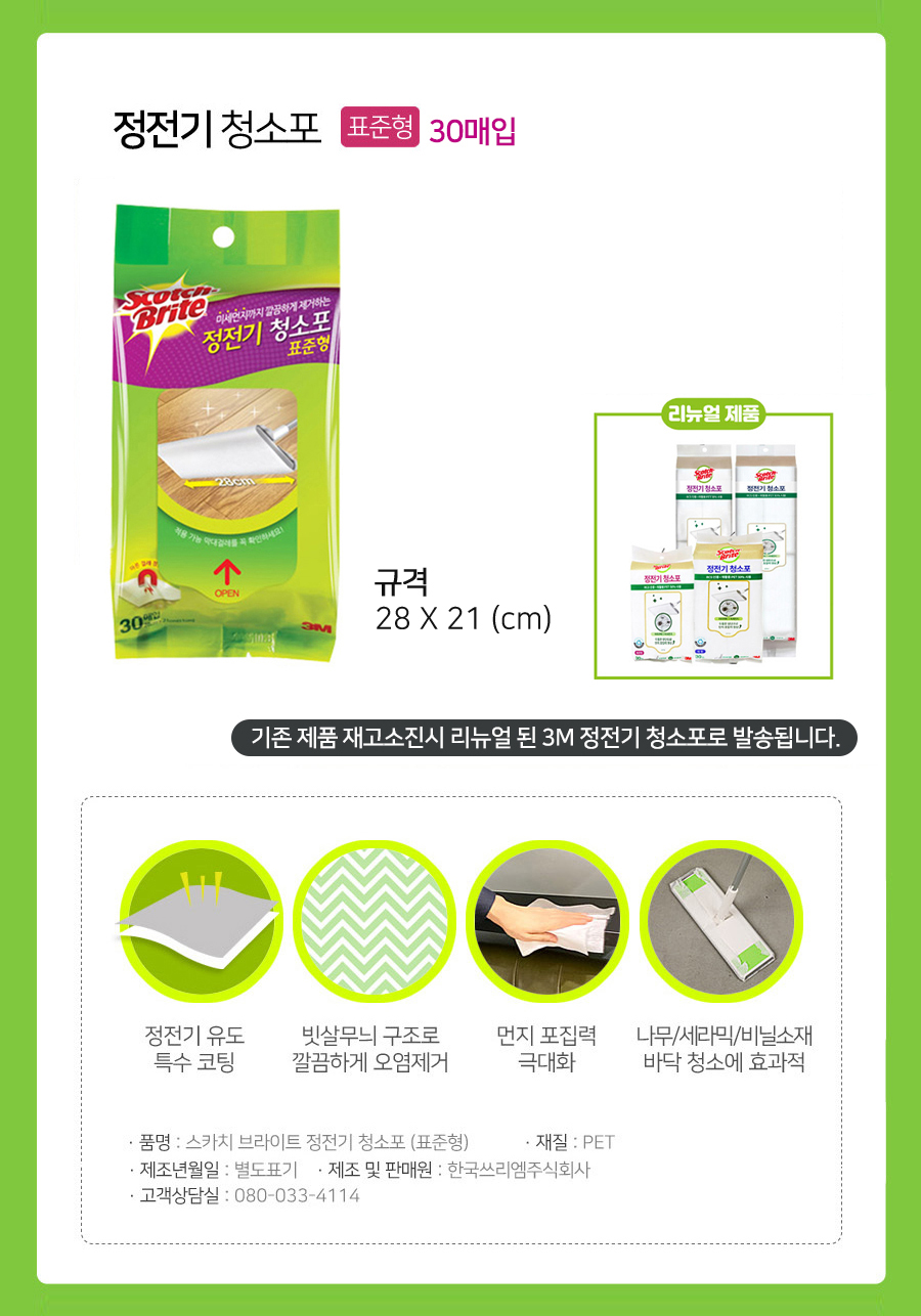 | 상품정보제공고시 | 품명: SE 3M 정전기 청소포 표준형 30P 모델명: TS14279879 제조자(수입자): 상세페이지참조 제조국: 대한민국 A/S 책임자와 전화번호: 상세페이지 참조 |